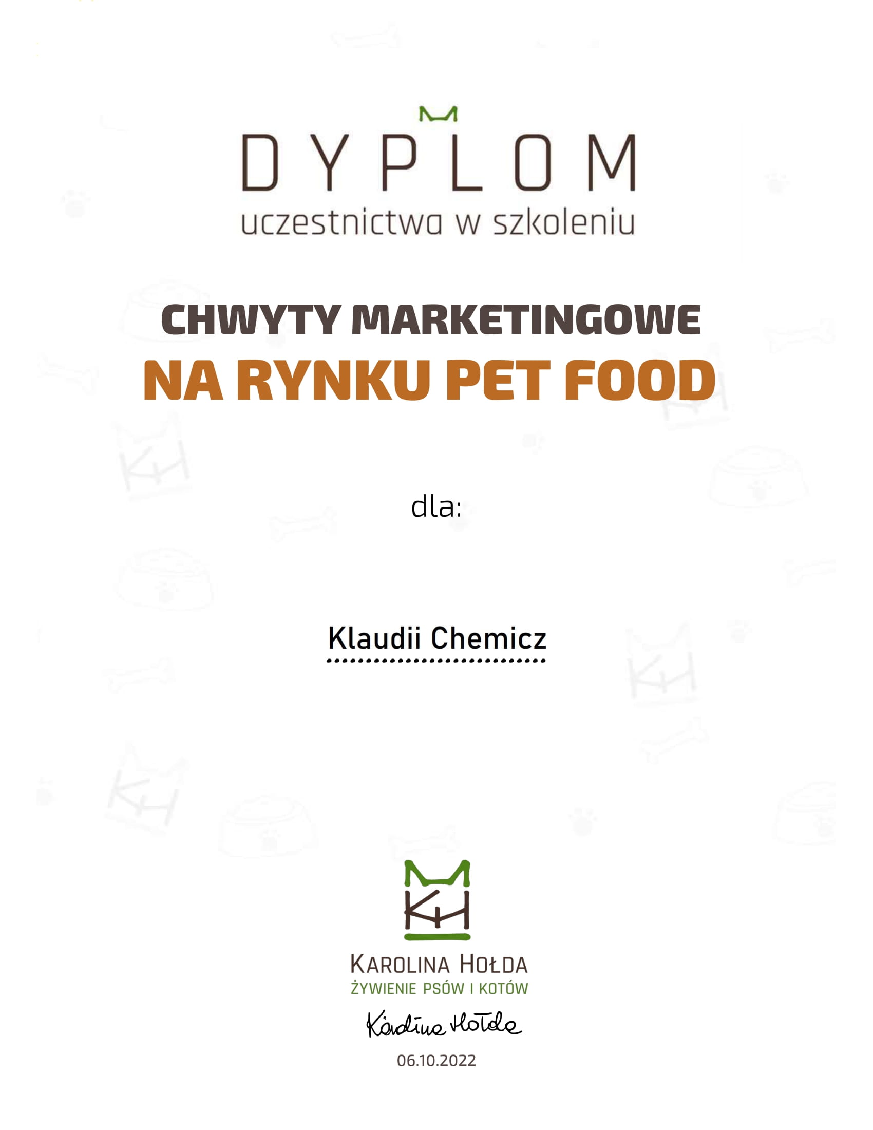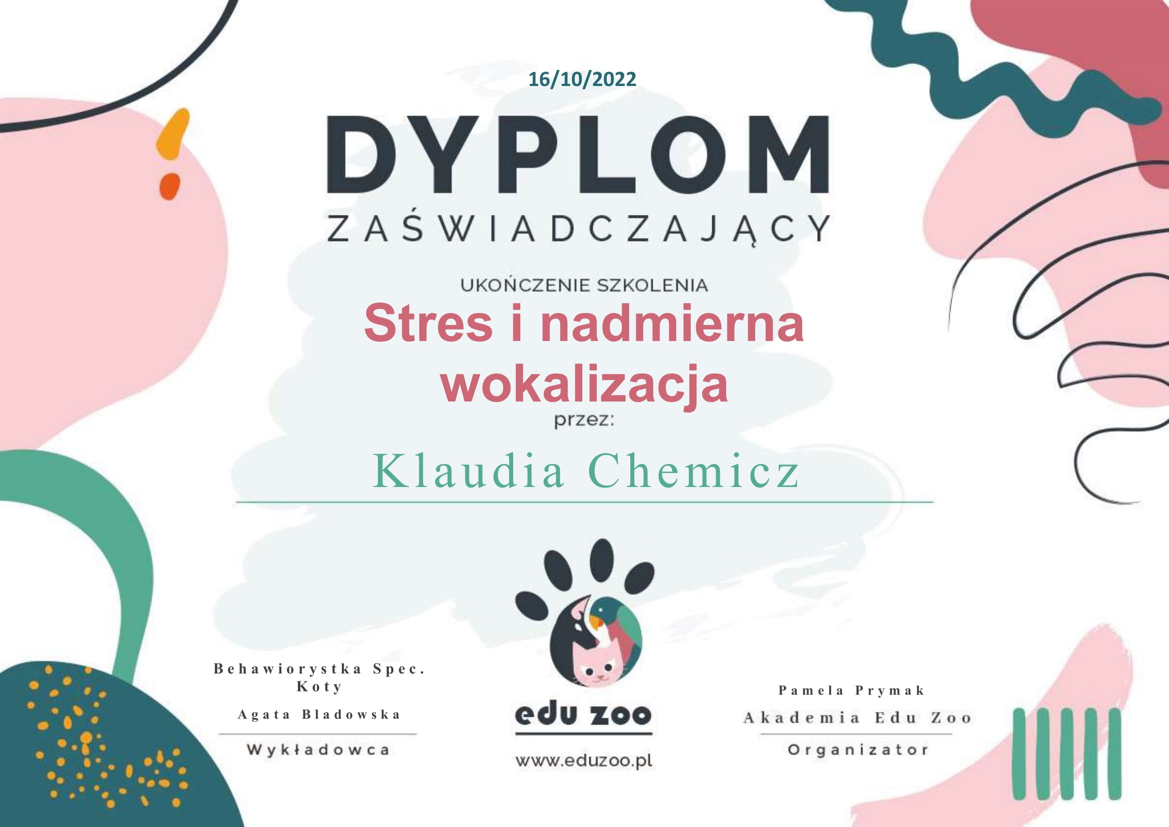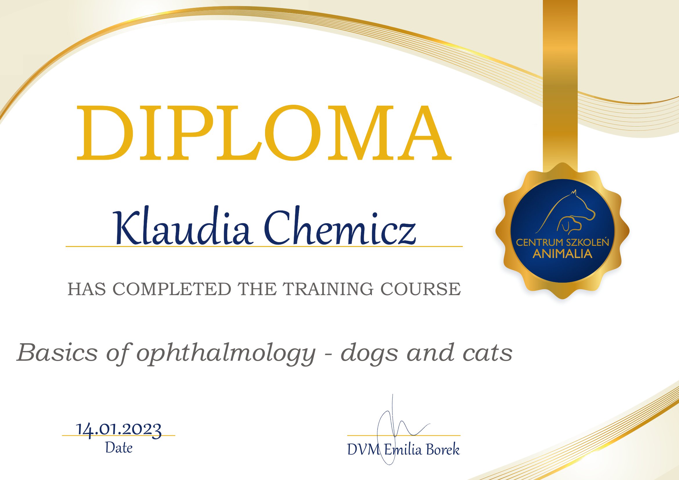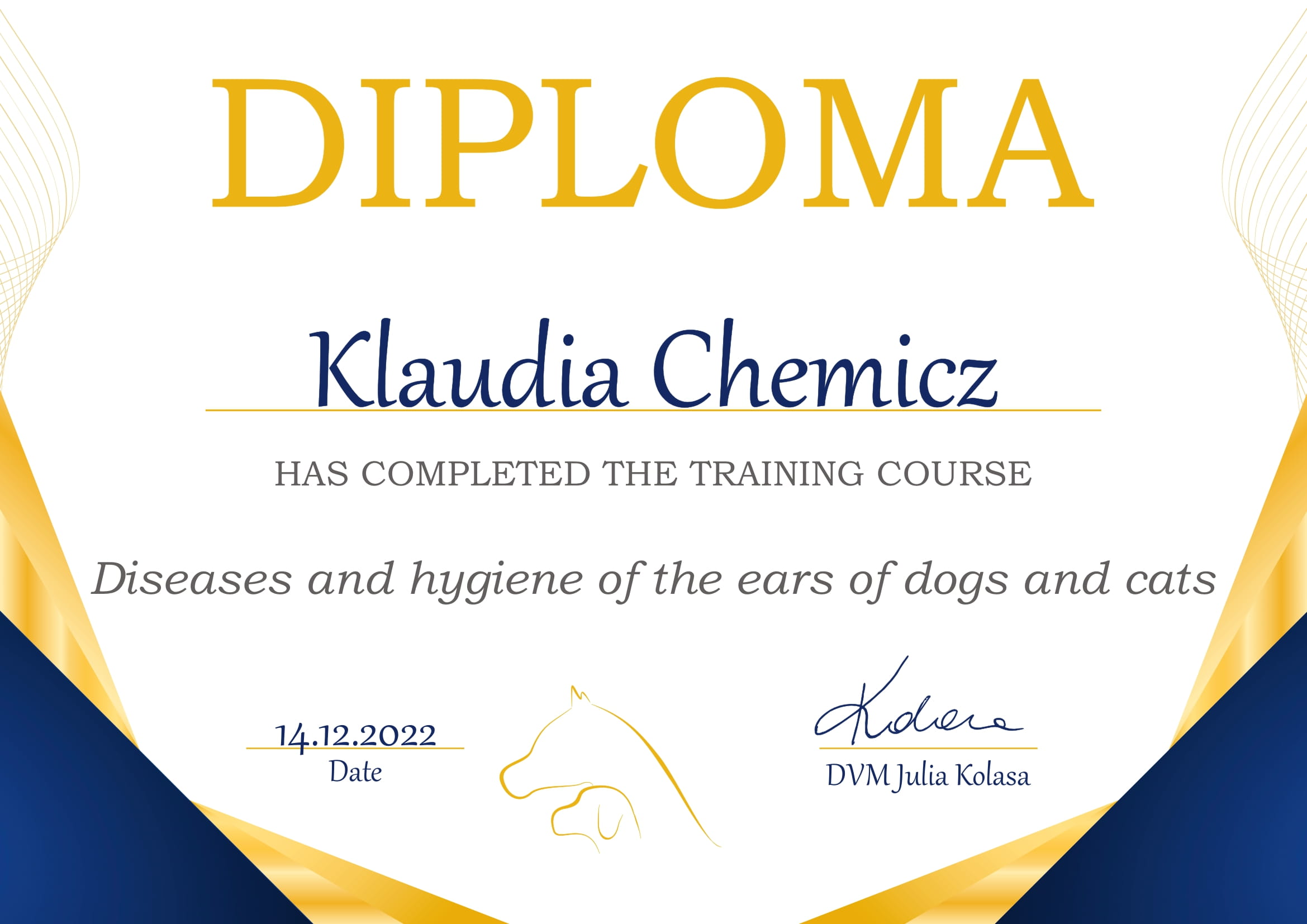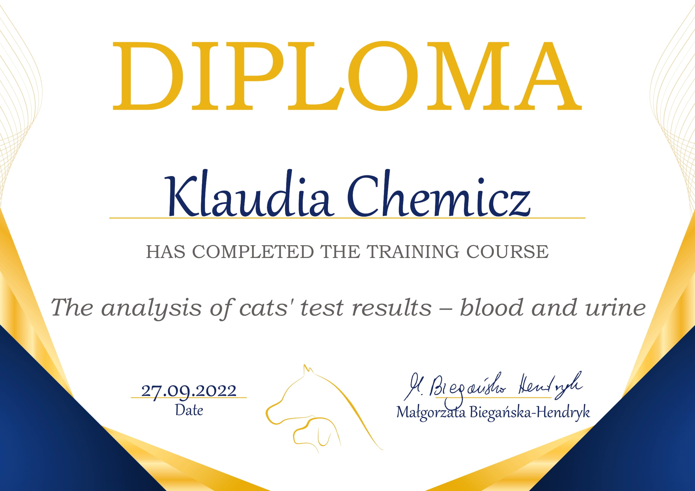 Jestem absolwentką studiów podyplomowych na kierunku „Behawiorystyka zwierząt towarzyszących – koty” w Wyższej Szkole Europejskiej im. ks. Józefa Tischnera w Krakowie. W 2020 roku ukończyłam kurs zawodowy nadający kwalifikacje do pracy jako Zoopsycholog. Specjalizuję się w terapii zaburzeń zachowania u kotów, przeprowadzam konsultacje behawioralne dla kocich opiekunów.