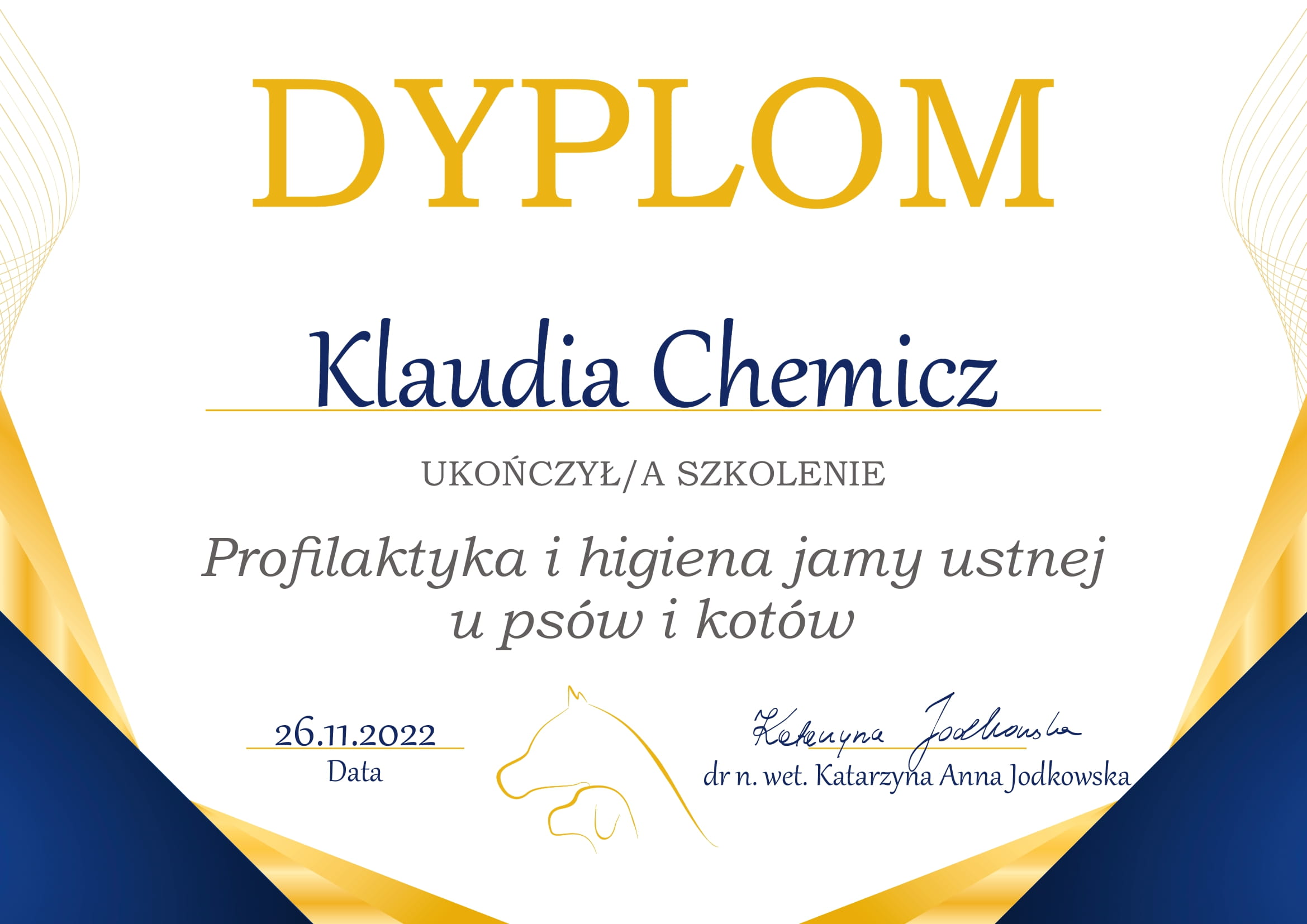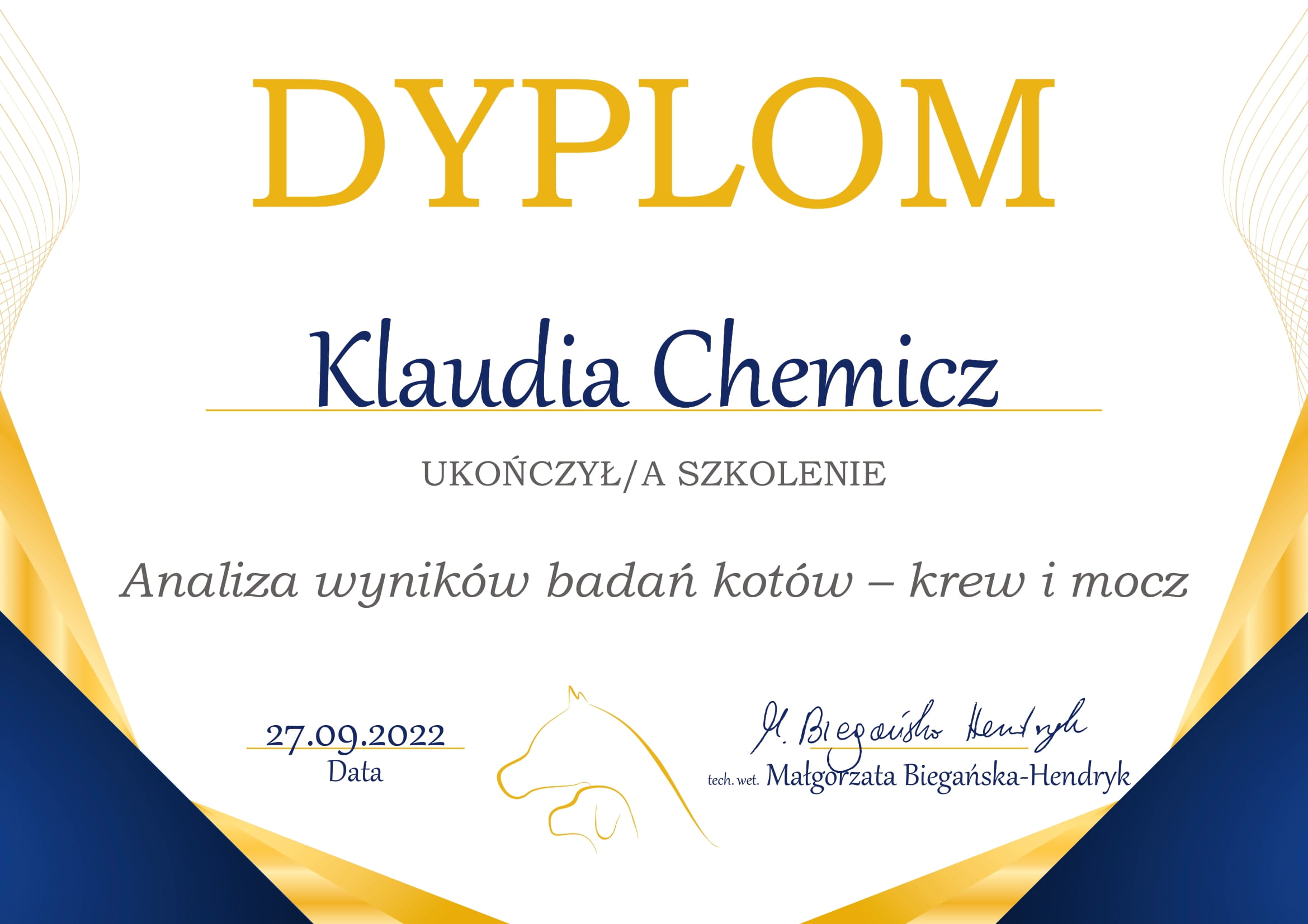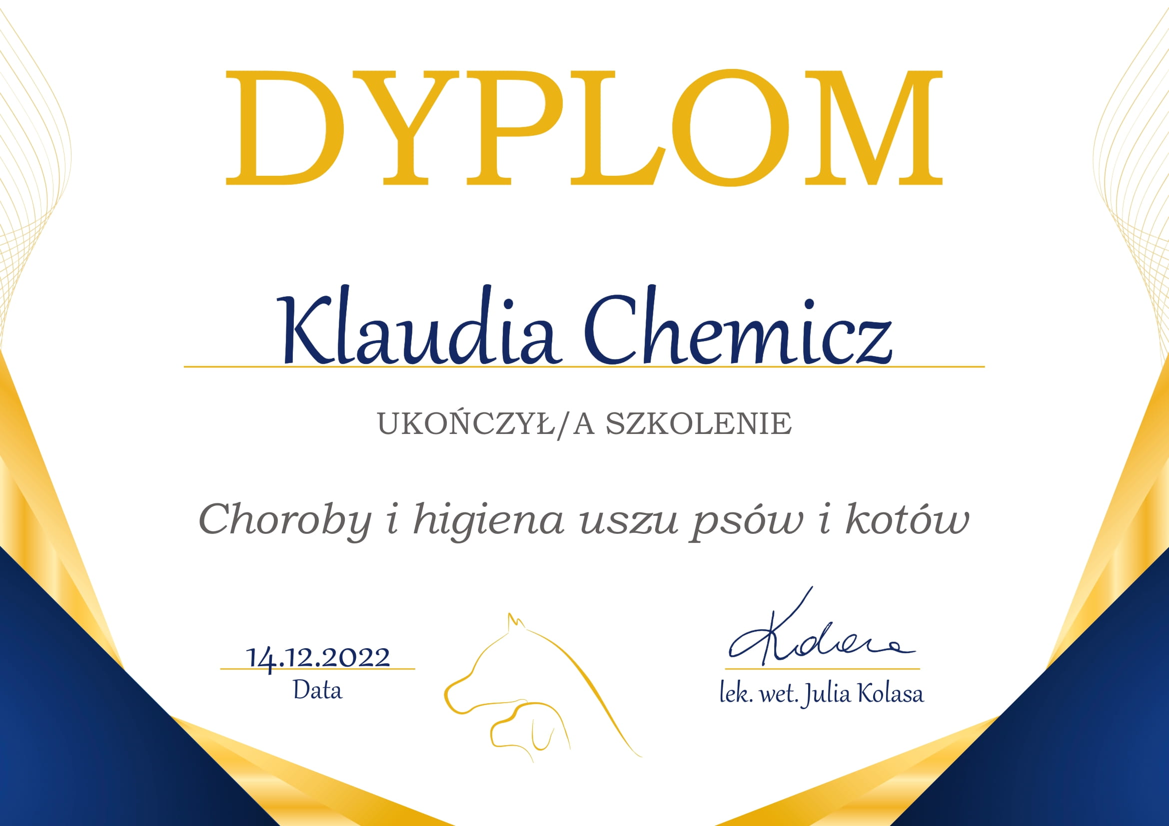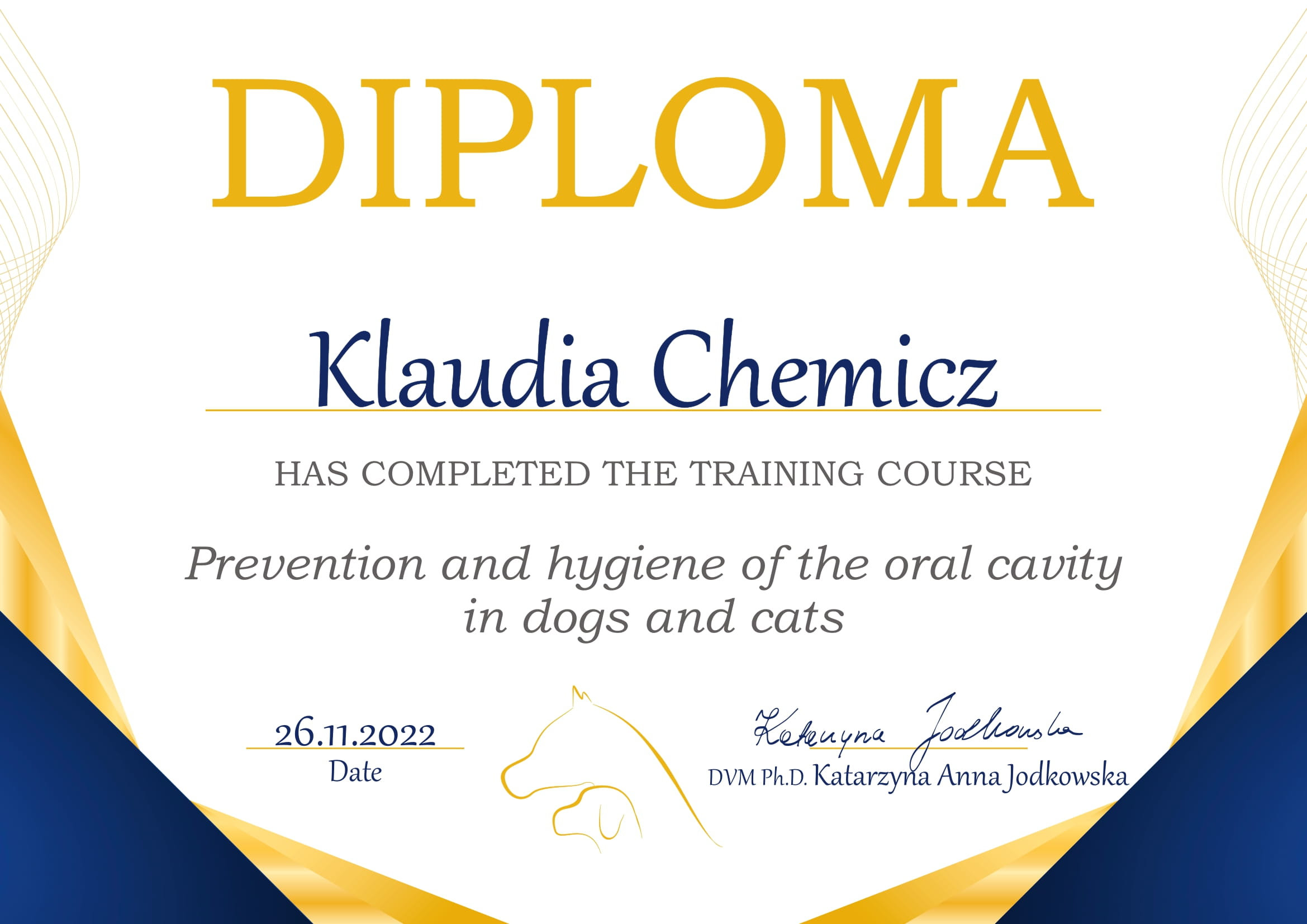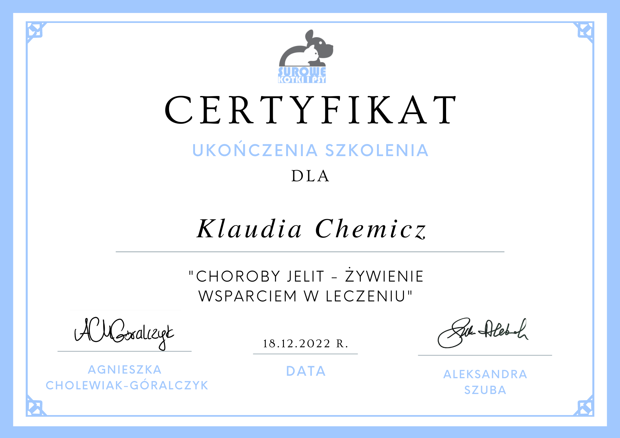 Jestem absolwentką studiów podyplomowych na kierunku „Behawiorystyka zwierząt towarzyszących – koty” w Wyższej Szkole Europejskiej im. ks. Józefa Tischnera w Krakowie. W 2020 roku ukończyłam kurs zawodowy nadający kwalifikacje do pracy jako Zoopsycholog. Specjalizuję się w terapii zaburzeń zachowania u kotów, przeprowadzam konsultacje behawioralne dla kocich opiekunów.