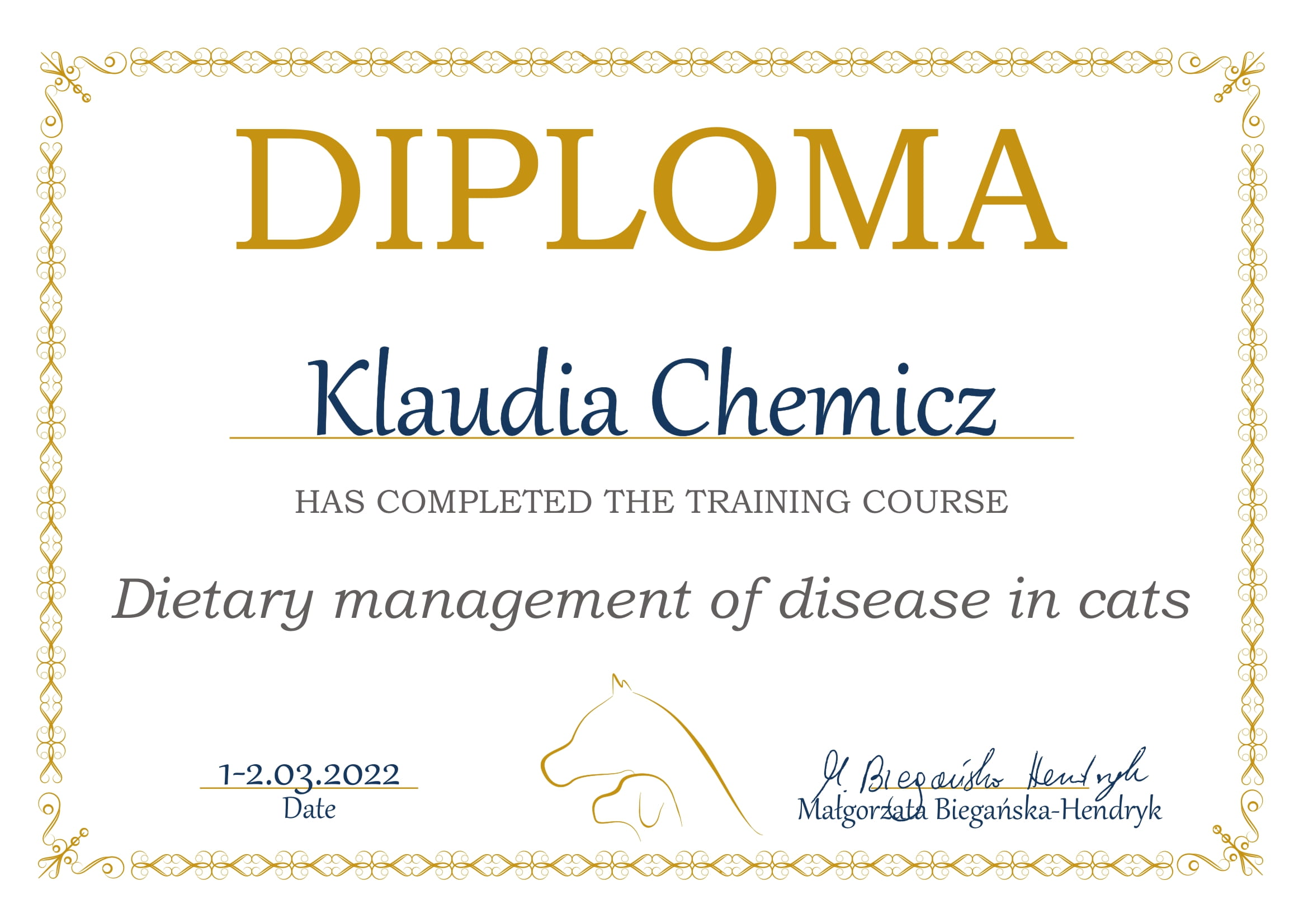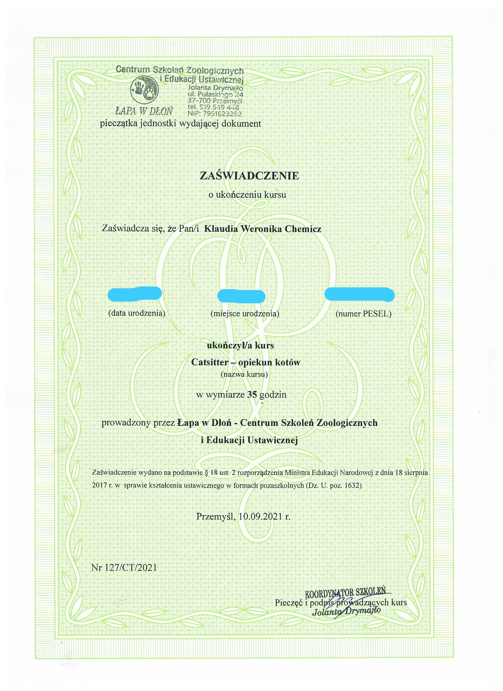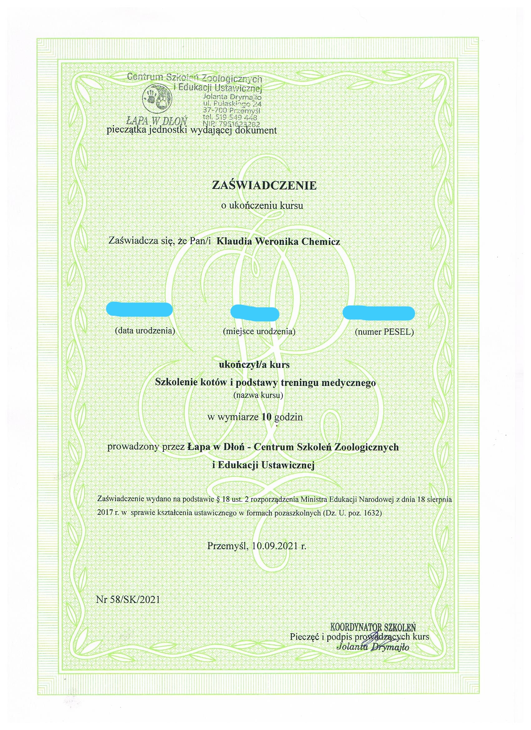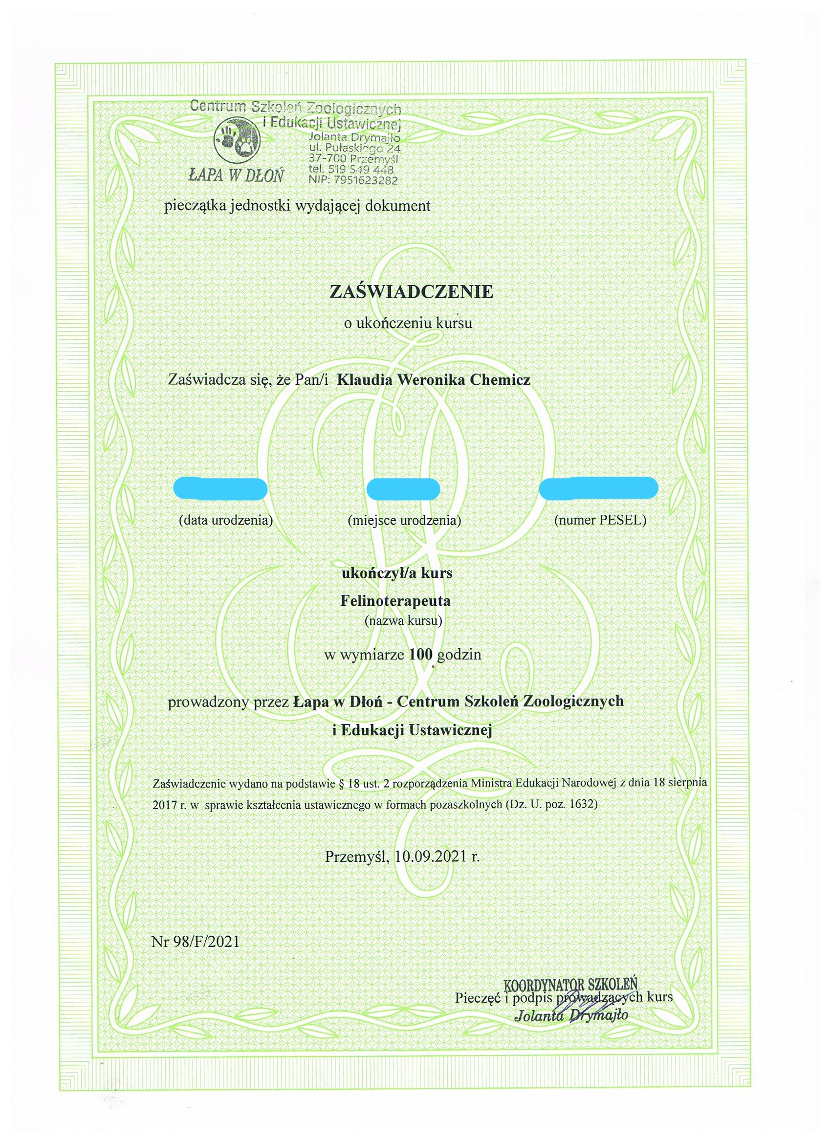 Jestem absolwentką studiów podyplomowych na kierunku „Behawiorystyka zwierząt towarzyszących – koty” w Wyższej Szkole Europejskiej im. ks. Józefa Tischnera w Krakowie. W 2020 roku ukończyłam kurs zawodowy nadający kwalifikacje do pracy jako Zoopsycholog. Specjalizuję się w terapii zaburzeń zachowania u kotów, przeprowadzam konsultacje behawioralne dla kocich opiekunów.