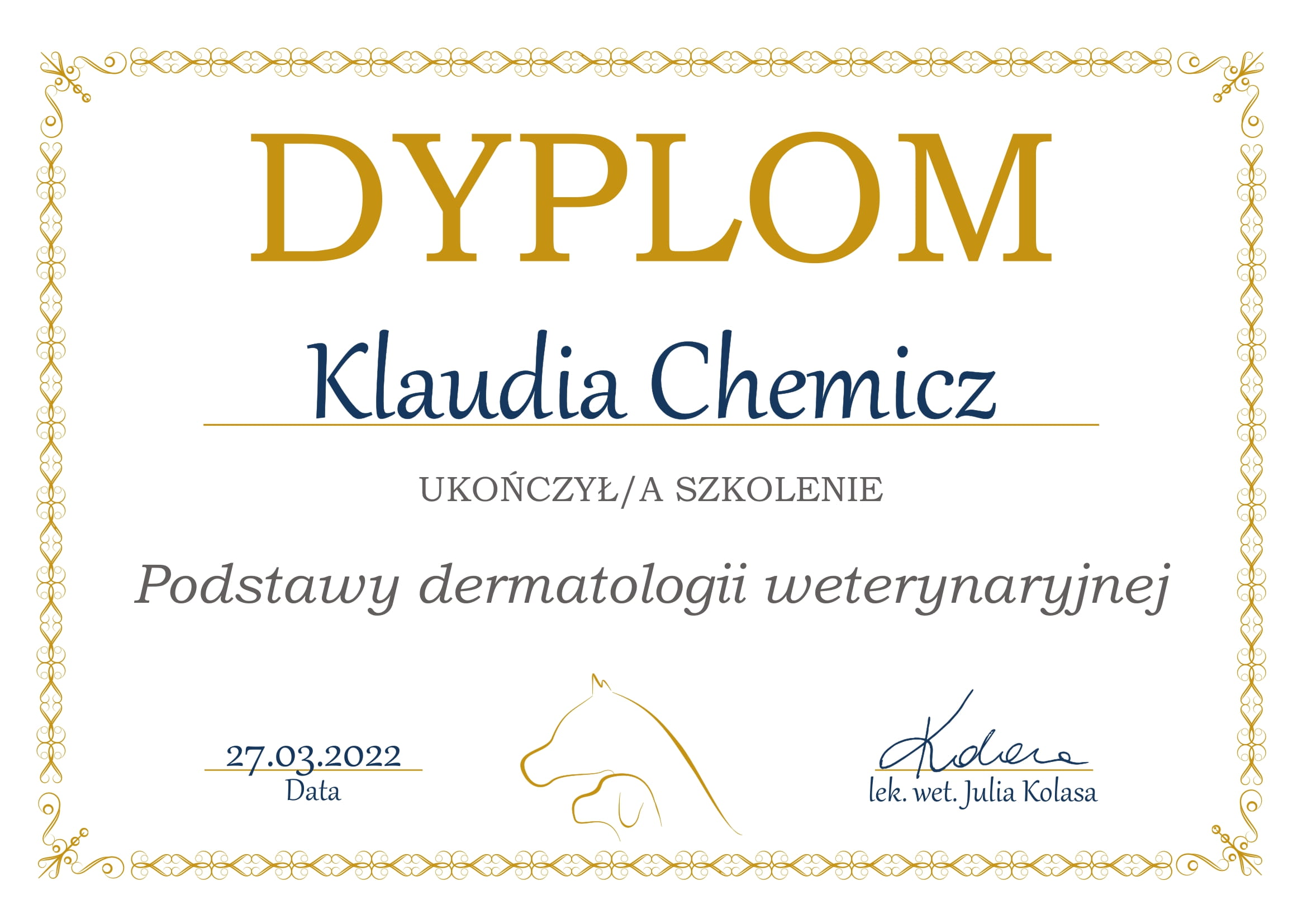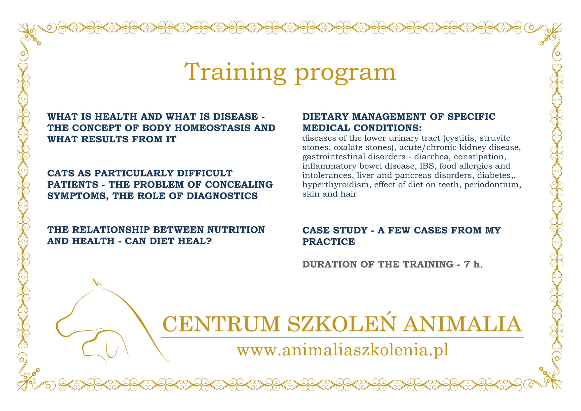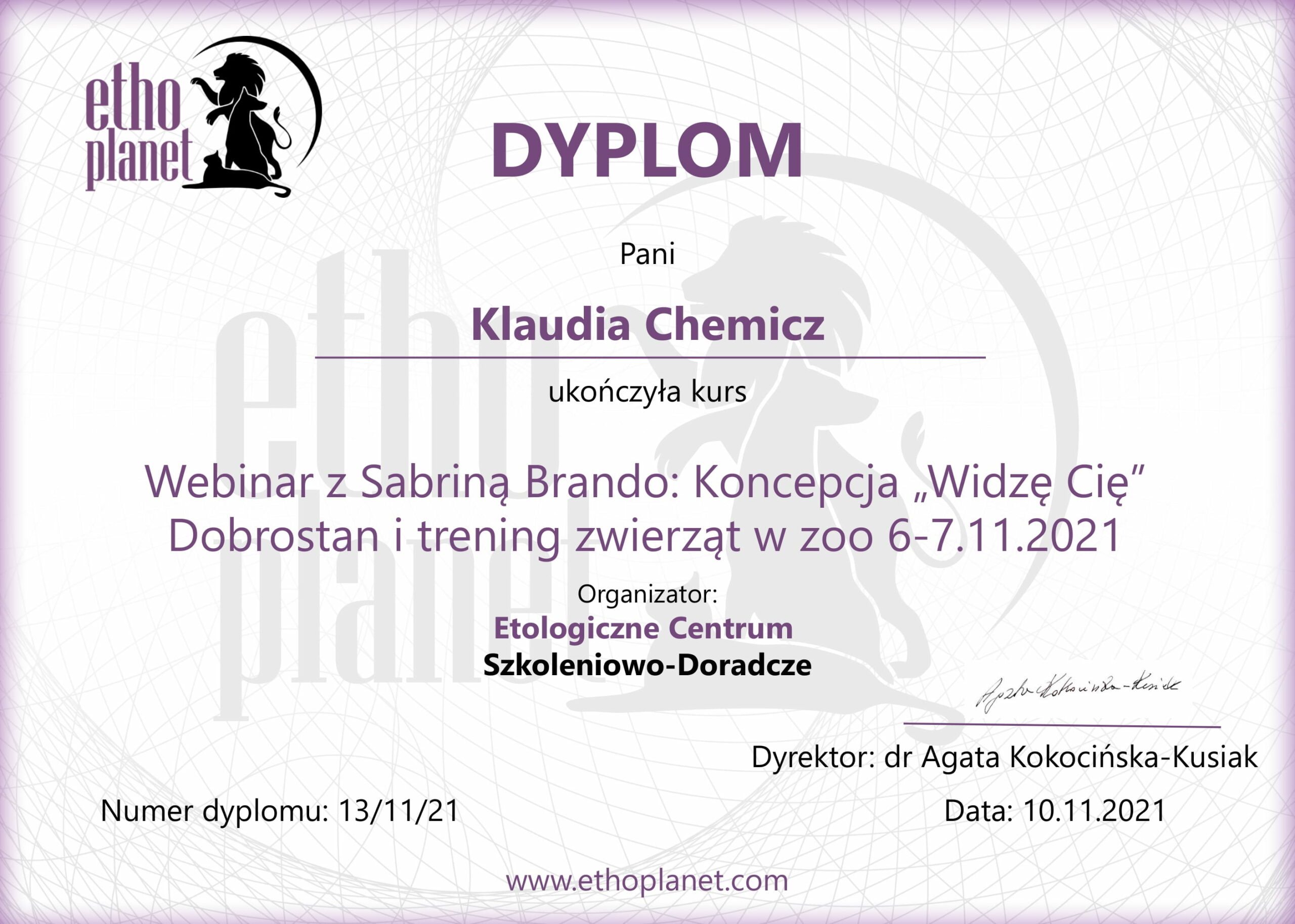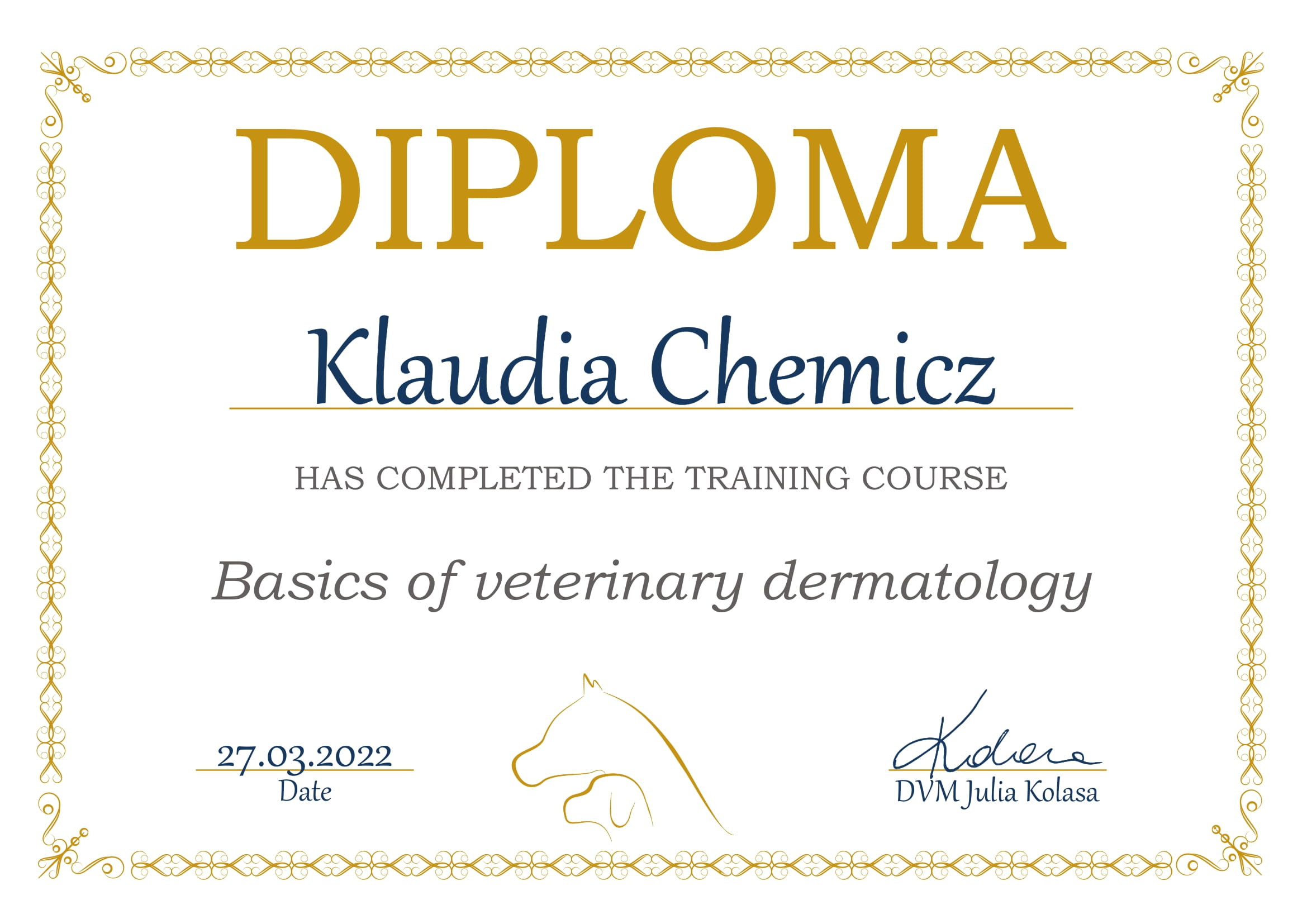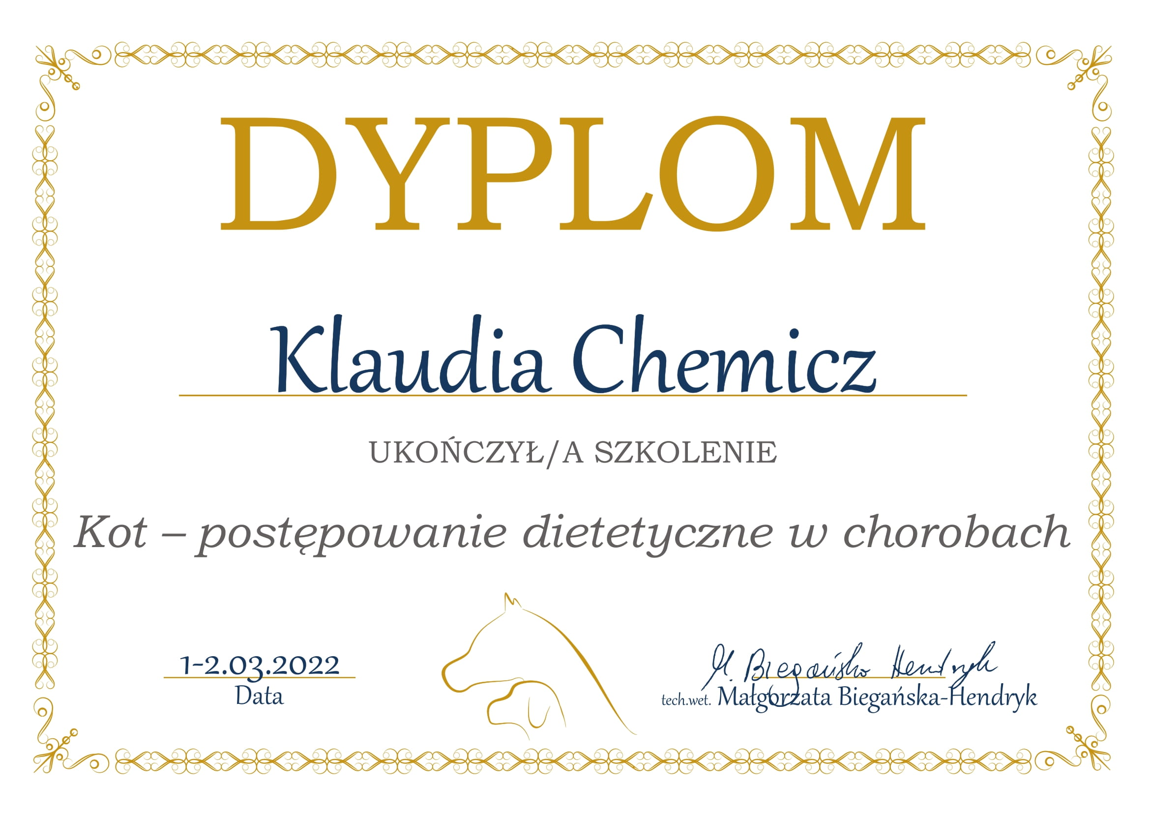 Jestem absolwentką studiów podyplomowych na kierunku „Behawiorystyka zwierząt towarzyszących – koty” w Wyższej Szkole Europejskiej im. ks. Józefa Tischnera w Krakowie. W 2020 roku ukończyłam kurs zawodowy nadający kwalifikacje do pracy jako Zoopsycholog. Specjalizuję się w terapii zaburzeń zachowania u kotów, przeprowadzam konsultacje behawioralne dla kocich opiekunów.